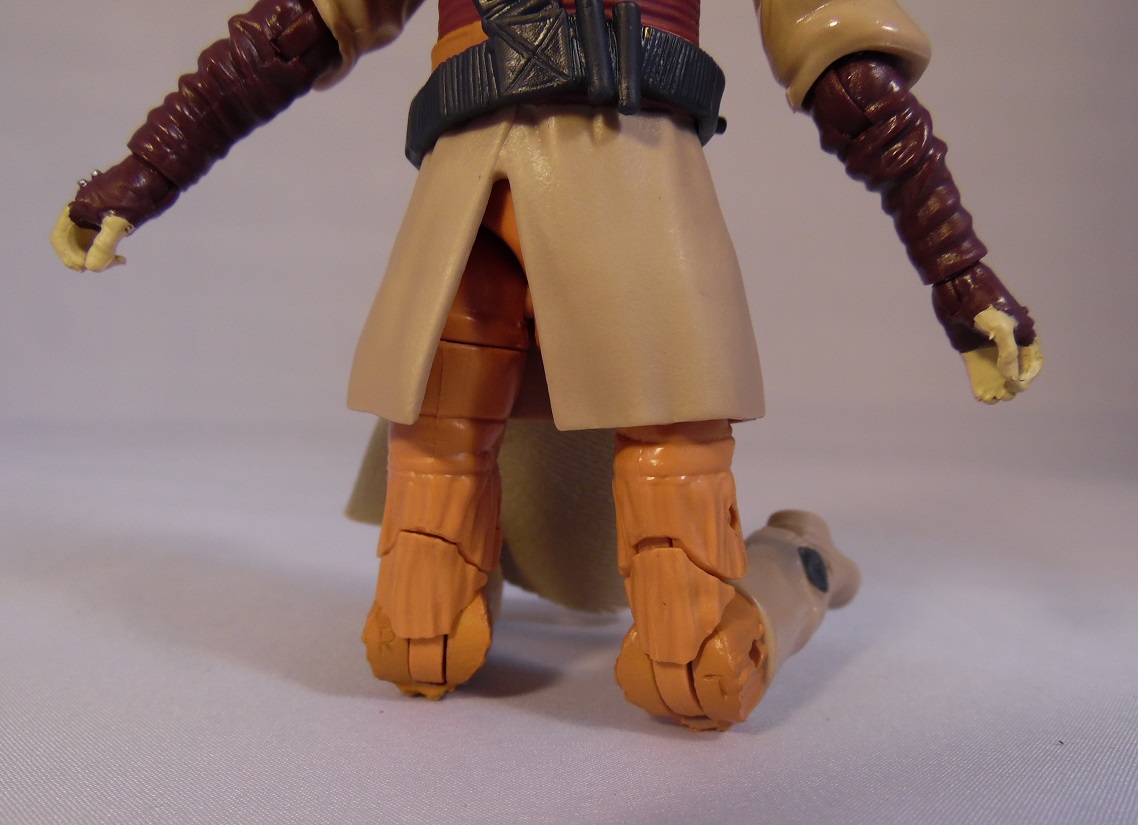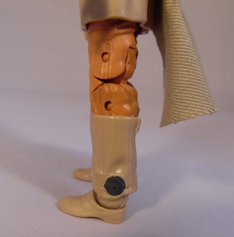 Leia's torso has a joint which gives a bit of upper body swivel to either side. The legs are then jointed under the flexible skirt at the hips. The skirt isn't quite flexible enough to put Leia into a crouching position so the hip articulation is more or less wasted. The double jointed knees however allow Leia to kneel down and the ankles are on rockers to get a good foot plant and hold her stable on display.