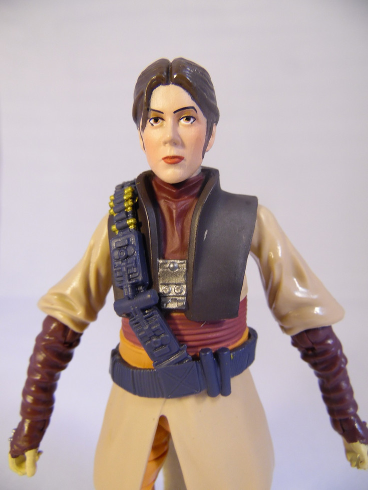 I really like the head sculpt on this figure, capturing a determined Leia and the head is only let down by a bit of a heavy handed paint job at the factory with thick black lines of mascara around the eyes and overly red lipstick. The hair is a tad soft without the detail I have seen recently in Rey from TFA, it is also a very flat brown paint job and could have been improved with a second or third paint application to bring out more detail.