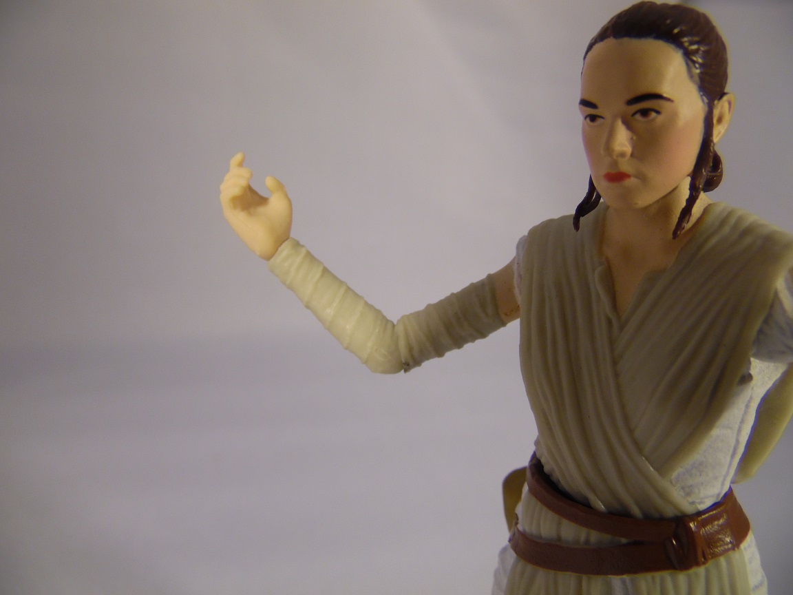 The waist is jointed, but moves very little - springing back to a central position. Hips are ball jointed and if needed you can use these and the knee joints to get Rey into a splits or kneeling position. However, the sculpted robe does restrict the leg movement and you could argue maybe should have been soft goods, but that will always be controversial and not to every ones tastes. Rey stands pretty well with articulated ankles.