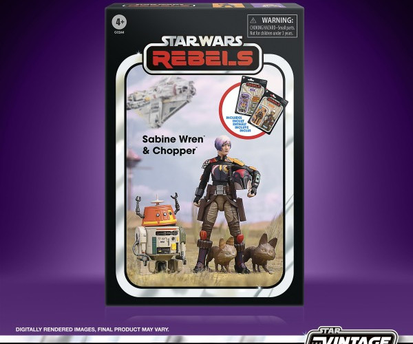 To commemorate her friends’ heroic efforts in liberating Lothal, Sabine Wren painted a colorful mural in the Capital City – a testament to the Ghost crew’s lasting friendship. Astromech droid Chopper is a resident droid of the Ghost, assisting the crew in everything from ship maintenance to combat. Fans can celebrate the legacy of STAR WARS, the action-and-adventure-packed space saga from a galaxy far, far away and build out their Spectre Crew with this premium 3.75-inch scale STAR WARS: THE VINTAGE COLLECTION SABINE WREN & CHOPPER (C1-10P) figure pack inspired by the characters’ appearance in STAR WARS: REBELS. These figures feature premium detail, entertainment-inspired collector grade deco and design across product and packaging inspired by the original Kenner line, as well as character art inspired by Sabine’s mural in the series finale. Includes 2 figures and 9 entertainment-inspired accessories including an interchangeable helmet head, jetpack, energy shield, 2 blasters and a jetpack flame accessory for Sabine, as well as a removable radar dish and 2 Loth-cats for Chopper.