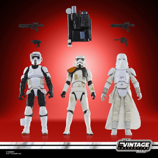 The Vintage reveals kicked off with a new three-pack celebrating the Stormtroopers of the original Trilogy. The set includes a Sand Trooper from A New Hope, a Snowtrooper Commander from Empire Strikes Back, and a Scout Trooper from Return of the Jedi. The set is a Hasbro Pulse Exclusive with pre-order going live on May the 4th