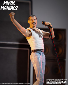 McFarlane's next Music Maniacs 6-inch scale release is the iconic Freddie Mercury from Queen. He is depicted in his white vest, and jeans as seen at Live Aid in 1985, Ge comes with a microphone stand accessory.