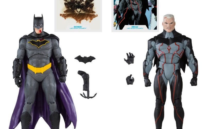 The set features The Last Knight on Earth Batman with 'bloodied' paint job, batarang and grappling gun. Omega will feature a new unmasked head, as well as a pair of alternative hands. Collectible cards are also included in the 2-pack, but no display bases.