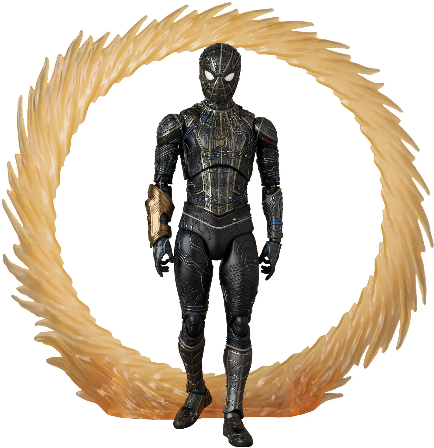 Spider-Man in his distinctive black-and-gold suit from "Spider-Man: No Way Home" joins the "MAFEX" action-figure lineup from Medicom! This insanely posable figure comes with three interchangeable heads, plus effect parts for the Magic Gate, the Magic Gauntlet, various web parts, and an articulated figure stand for airborne wall-crawling poses! Order him for your own collection today!