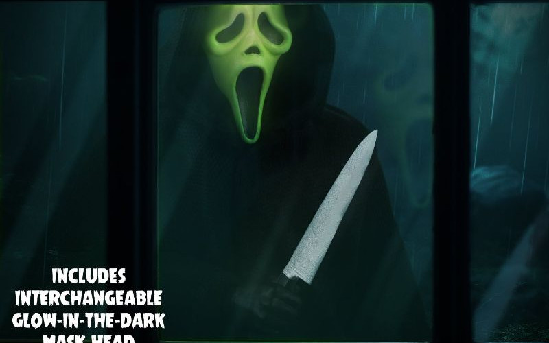 Ghost Face wears his signature black hooded robe, with posable hood and sleeves through integrated posing wire. He swings knives or a reaper’s scythe, complete with multiple blood FX that attach to weapons. The mysterious killer also carries a popcorn bowl and a remote control for perfect horror movie nights.