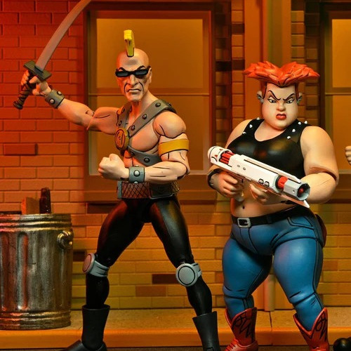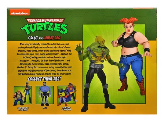 Based on the classic 1980s Teenage Mutant Ninja Turtles cartoon series! Start building Bebop and Rocksteady’s full gang with this 2-pack of action figures that are ready to rumble. Jersey Red might have avoided mutation, but her mohawk-sporting pal Grunt was not so lucky. This set includes two 7" scale action figures and accessories. Jersey Red comes with extra hands, laser, and a retro mutagen aerosol can. Grunt comes with interchangeable mutant parts, sword and extra hands. Comes in the classic cartoon 2-pack style packaging you all know and love.