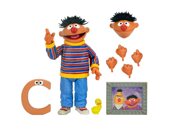 Celebrate your favorite childhood pal Ernie with this 7-inch scale action figure. Featuring 27 points of articulation, this figure is a must-have for any fan of the mischievous character. Accessories include interchangeable heads and hands, rubber duckie, framed picture of Bert and Ernie, and the letter “C”! Complete the famous duo with Ultimate Bert! Comes in collector-friendly window box packaging with opening front flap.