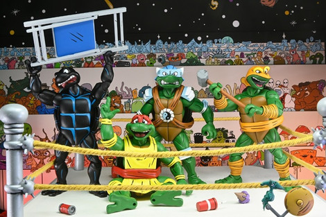 An action figure first! Straight from the pages of Eastman and Laird’s Teenage Mutant Ninja Turtles Adventures comic book series from Archie Comics, it’s the Stump Wrestling Turtles! Featuring all-new sculpts based on their iconic wrestling appearance, these 7-inch scale action figures include extra hands for all the grueling, intergalactic Greco Ro-man grappling and gut busting adventure! This NECA action figure 4-pack comes with all the wrestling staples: folding chair, sledgehammer, fire extinguisher, ice cream cone, and soda can. Plus, ringside bell and space pterodactyl! The package insert can also double as a backdrop for your display and photography needs... talk about collector-friendly! Comes in packaging with very special box art by original TMNT Adventures artists Ken Mitchroney and Gary Fields!