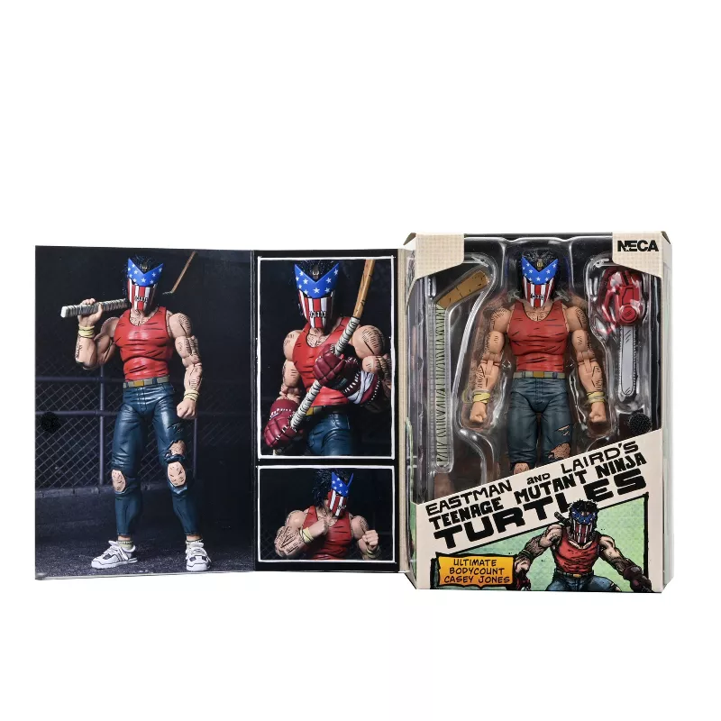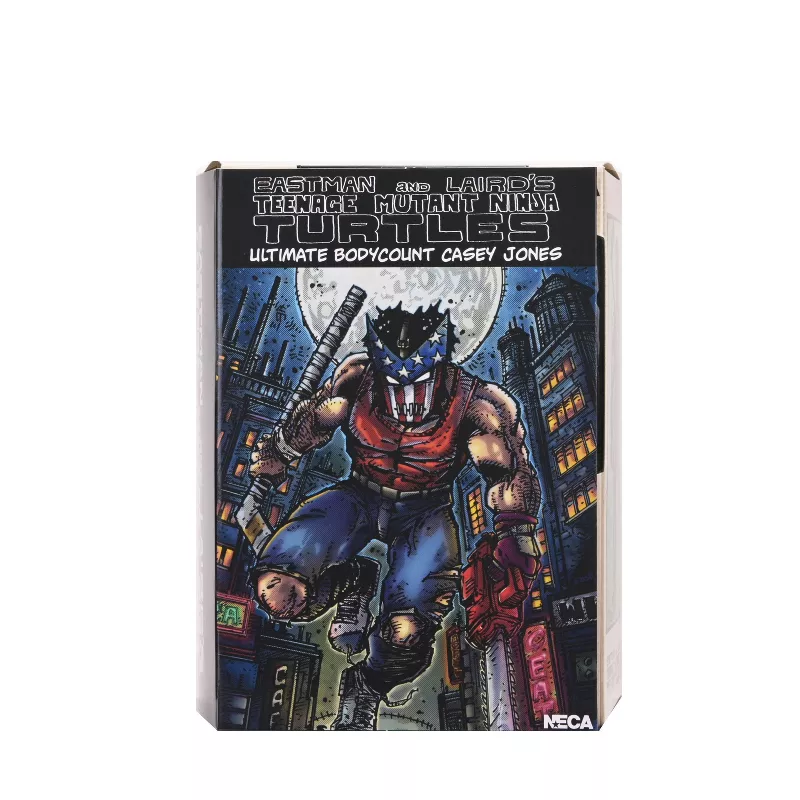 From Eastman & Laird’s Teenage Mutant Ninja Turtles comic books from Mirage Studios! Upgrade your TMNT collection with this Ultimate Casey Jones action figure from NECA. Featuring an all-new sculpt and mask with American flag deco, this figure of everyone’s favorite sports fanatic vigilante stands in 7-inch scale. Accessories include interchangeable heads and hands, hockey stick, gloves, bottle, chainsaw, and extra hands. Comes in collector-friendly packaging with original artwork by Kevin Eastman.