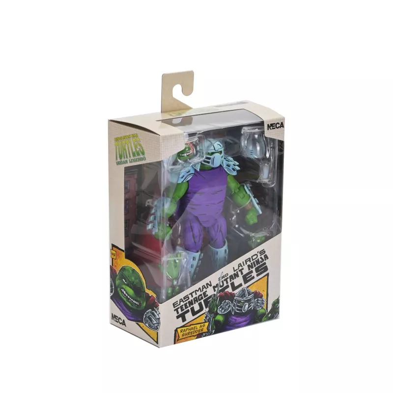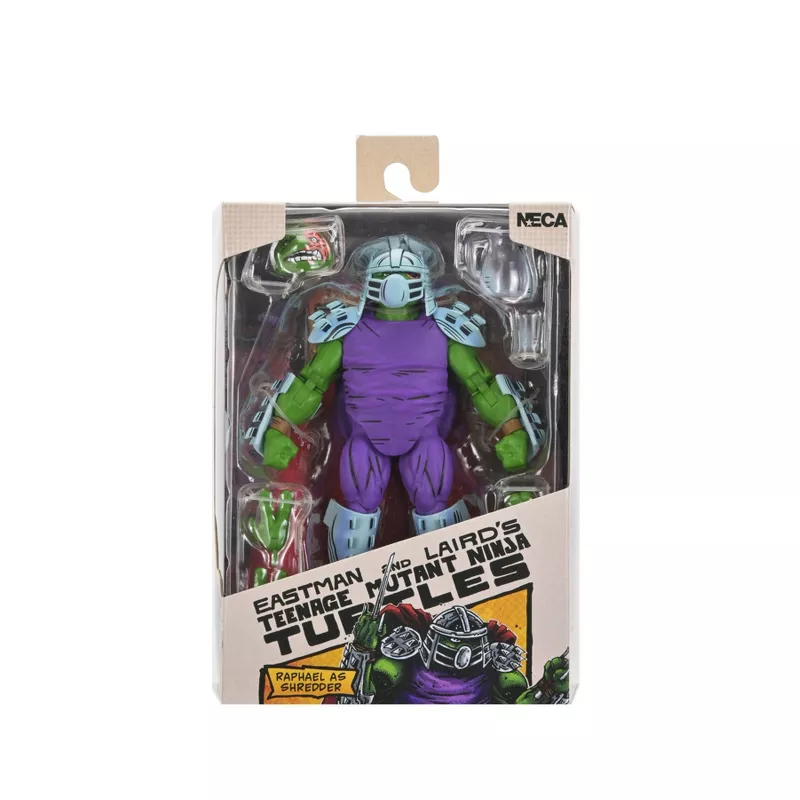As seen in Eastman & Laird’s Teenage Mutant Ninja Turtles comic books from Mirage Studios! Raphael takes the mantle of The Shredder with an all-new sculpt from NECA. This 7-inch scale action figure includes two heads (damaged and angry eyepatch). Plus, a soft goods cape, removable helmet, extra hands, sais, pitcher, and glass. Comes in collector-friendly packaging with original artwork by Kevin Eastman.