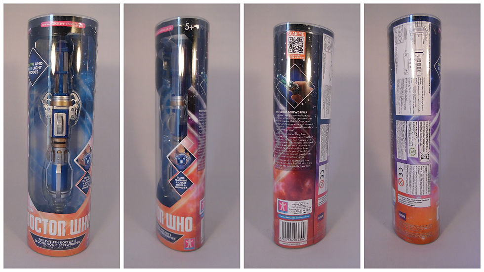 Back to the front and the whole sonic is clearly visible through the windowed portion of the tube packaging, and behind it sits another star field, framing the screwdriver beautifully. This will certainly please Mint in Box collectors who can leave the Screwdriver as is for their collections.