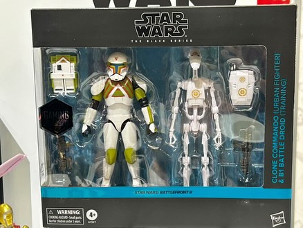 From the Star Wars Black Series, there was nothing immediately new on the table. But we do get another look at the incoming Amazon Gaming Greats 2-packs featuring Dagan Gera and Commando Droid, and the Commando Clone and Battle Droid.