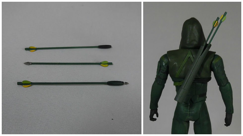 Arrow comes with his bow and a selection of three single arrows. Starting with the arrows these are cast in a very hard plastic. This makes them very straight and crisp, but it gives them not a lot of bend and they will break easily. Each arrows is different, which is a neat touch, including a standard arrow, a flammable arrow and a third that seems to be a bit of both. The flights are painted with yellow and green alternating colours. When not in use the arrows are designed to slot into the quiver on the reverse of the figure. Sadly the quiver carries on the theme of being too slim and only two of the three arrows will fit at any one time.