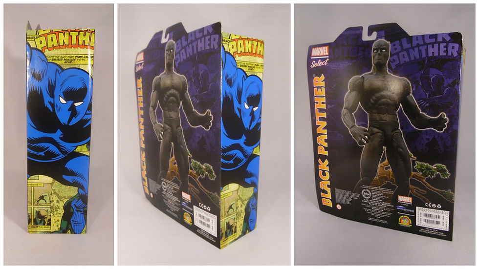 Black Panther, being a Disney Store Exclusive, comes in a slightly slimmed down box than the usual Select figures - depth wise at least. Like all Select figures the box is a huge clear blister around which is wrapped a side panel and card back. Like all Select's the side panel is the true star of the packaging with a full image of an almost blue Comic Black Panther against a vibrant comic book yellow background. Round the back and the imagery changes to that of the figure, which dominates almost the full card back. There is no bio or background info or any checklists of "other figures".