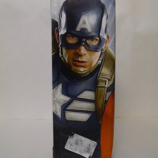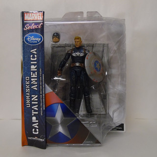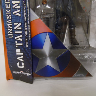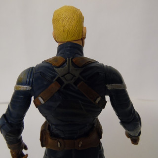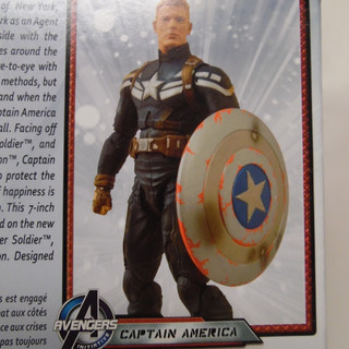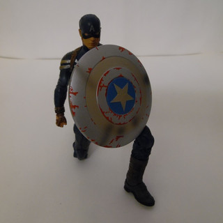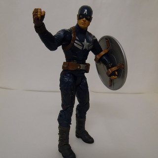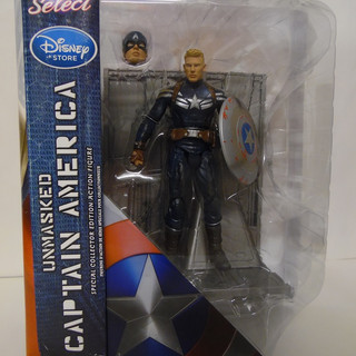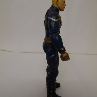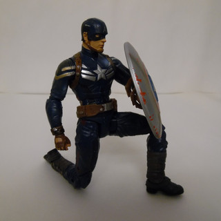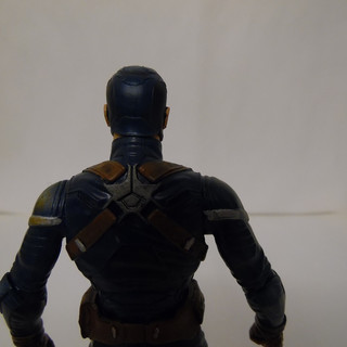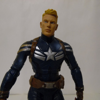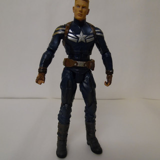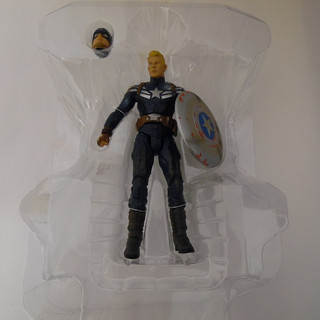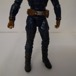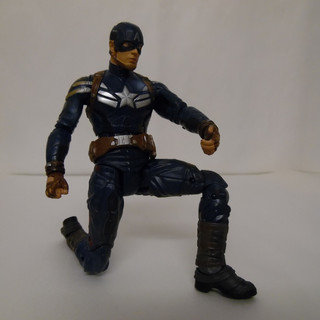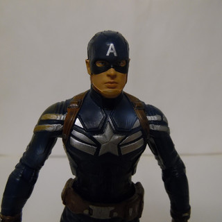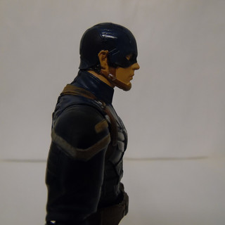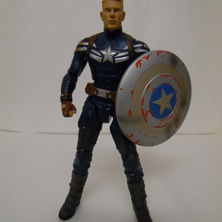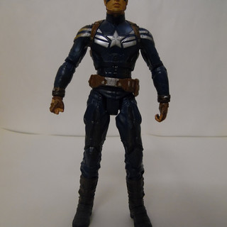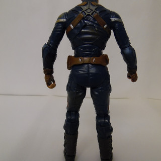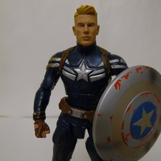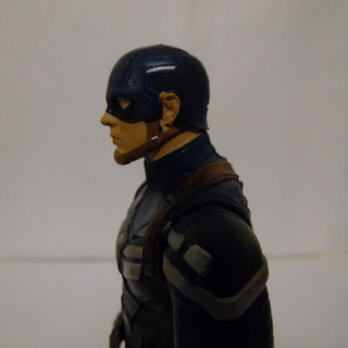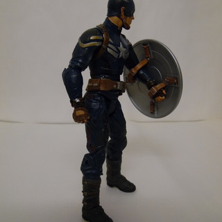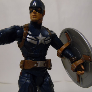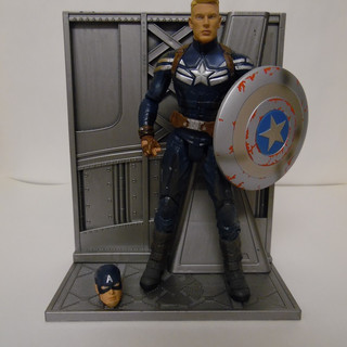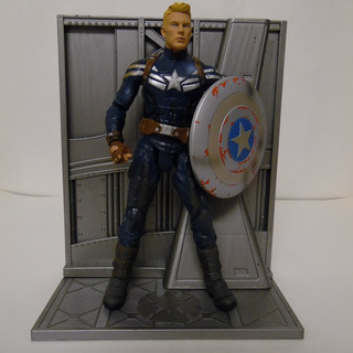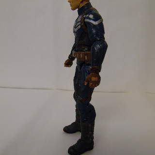 There are two versions of this. The first is the standard release, which included a masked Captain and a standard painted shield. This is not 100% accurate as Cap used a blue & silver shield in the sequences where we wore the stealth suit. The second release was a Disney Store exclusive and included an unmasked Steve Rogers head, some "damage" to the suit and a damaged shield. The standard version is the easier of the two to find, but I was lucky enough to pickup the exclusive version. This review and the associated picture gallery are for the exclusive version. For anyone shopping for this figure then as with the first Captain America Movie Figure, there does appear to be knock off versions of this circulating in the Far East Cap comes in the standard Select Box with beautiful artwork on the side and a write up of the figure on the reverse Once cracked out of the box you will have the main figure, the alternative head, a shield and a large backdrop piece. The figure itself is really well done and is has been much improved on the First Avenger release. The sculpt is well done, with a lot more detail on the suit than shows up in images. Cap's face under the hood is much crisper. The alternative head never looked great to me in images, but up close it is much better than it looks - although is still not a brilliant likeness for Chris Evans, and I have no idea where that hair style came from. The shield is just a rehash of the original shield, but fits easier over the arms. The belt is nicely done and is loose on the figure so it slides up and down - still not sure what this is needed Painting is well done throughout. Yes it's all a dark blue, but within that are darker areas painted in and even some red down the sides. On the exclusive version there is some nice but subtle weathering added and there are very small scratches detailed into the chest.. The silver is crisp on the chest with no visible bleed into the surrounding clothing. The head and eyes are cleanly painted with very minor flesh colour bleed onto one side on the hood straps on my figure. The Shield is painted really well, it is very difficult to get a naturally distressed look, but they have achieved this. The best points on the figure are the articulation, which has come a long way in the 3years since the First Avenger Cap. The elbows and knees are much more natural yet still allow for a decent range of movement. Ankle rockers have also been added which makes standing Cap much better. The head is on a ball joint, so allows the head to look up and down as well as side to side. The head pops off to swap, its not the easiest to get off so I would consider warming it up slightly when swapping heads to reduce risk of any damage. The base piece supplied is the same as the piece that comes with Falcon, and is nicely detailed to depict a wall of the Shield Helicarriers, even including a SHIELD logo sculpted into the floor. It is painted a flat silver. This one works much better with Cap as a display piece where as on Falcon it looked a bit odd if you displayed Falcon on the stand with his wings in place. With the improved articulation, the nice paint job and the ankle rockers I give this Captain a 4 out of 5, overall DST were a bit lazy with not giving him the right shield and the Chris Evans head isn't a knock out. This is still not the definitive Cap, but is a good stand in and I just hope that DST will come good with a true Avengers Red, White and Blue version next year as part of Civil War