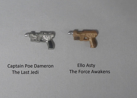 Poe is armed with a small Resistance blaster, the Glie-44. The sculpt has been released twice before - first with the original 2015 Poe Dameron in X-Wing flight suit, and then again with Ello Asty (also 2015). While the sculpt remains the same, the sculpt is sharper in a harder plastic. The colouring has differed on each appearance with this new one arguably the nicest having been cast in a bright silver and with black handle detail on the grip.