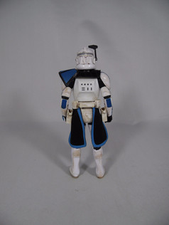 Rex also decorates his armour with tally marks for the battle droids he has destroyed. These start on the helmet, either side of the crest, in crisp black. The Jaig eyes Mandalorian symbol of courage in blue sits on the front of the helmet and the same blue then trims the visor and down to the breather gear. There is a viewfinder on Rex's right and this articulates so can be swung down over the eyes.