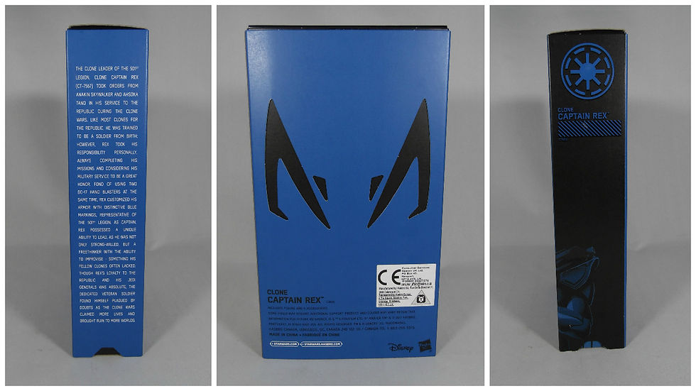 The right spine (which would be red on the current phase 3 box) is s black with the Republic logo at top in electric blue, and the character name as Clone Captain Rex. At the base of this right spine is a the side of the front image, wrapped around the corner of the box. The back of the box is essentially blue with two cut out segments to make a black design that replicates the one Rex wears on his helmet. There is a repeat of the character name down bottom left, but no character bio. The bio actually sits nicely on the left spine in white text and talks about Rex as "The Clone Commander of the 501st Legion" and then goes into his personality and how he personalised his armour - something we will see shortly.