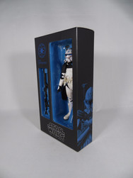He arrives in box that uses a sleeve design that we had seen previously on exclusives like the First Order Stormtrooper (2015) and Jyn Erso (2016). Like the 501st that Rex commands, the overriding colour scheme is blue - but with the black sub-tones to link it into the Black Series. The front of the blue box contains a Gregory Titus illustration of Rex down to the bottom right. The Black Series logo sits centre in bold. You will then start to notice the more subtle elements on the front like the tally marks - which will make more sense as we explore the figure more.