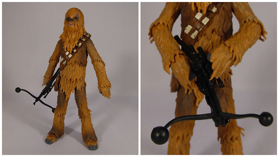 The bandoleer is amended to the new look, as is the saddle bag. The bowcaster has also had a makeover and is a new sculpt. This means the original issue with the bow part popping off has been fixed - hurray - but it also means that instead of a nice drybrushed gun metal finish all you get now is black plastic.