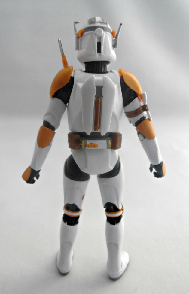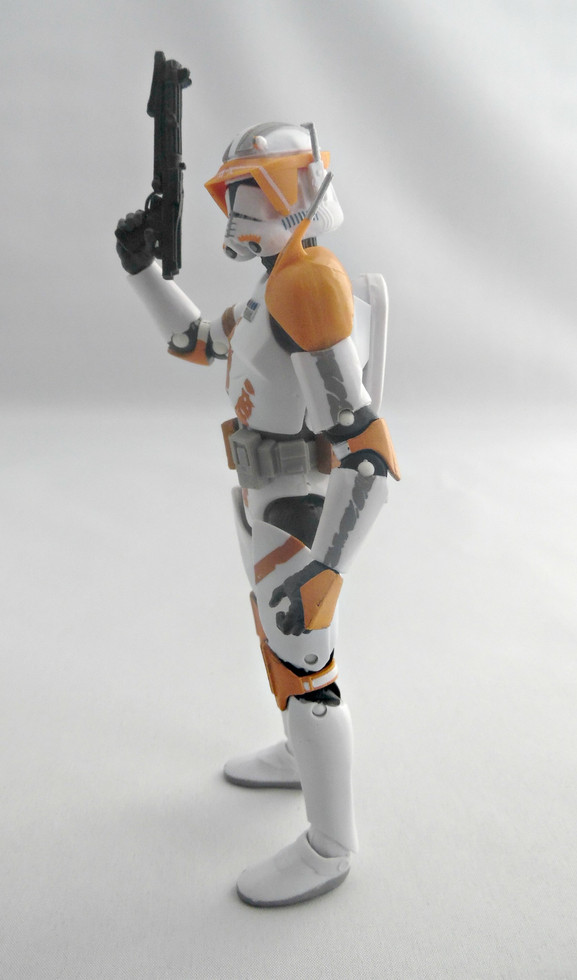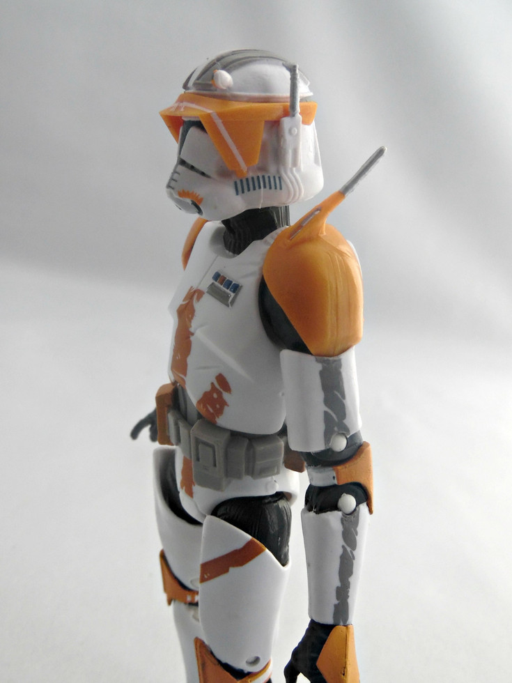 The chest piece is the first significant molding change with a more angular cut out at the stomach area. To signify his rank, Cody also has an insignia molded into the left of the chest and this again has at least 3, maybe 4 paint colours applied. Cody's chest piece is also sculpted with battle damage and this works really well even if it isn't painted as weathered. The orange colouring continues on the chest and rather than painted flat and clean, it is actually rough and "scratched" to add to the worn feel.