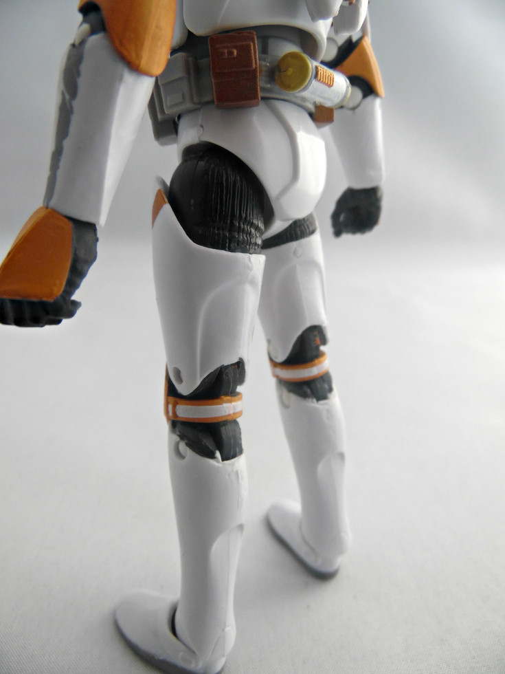 Starting at the feet - and there is no difference between the two clone types on the legs. On Cody you do get orange painted knee pads and this actually looks much nicer than the white clones as we all know the knee and elbow pads on the white clones look off white vs the rest of the armour. Cody also sports an orange flash across his left thigh.