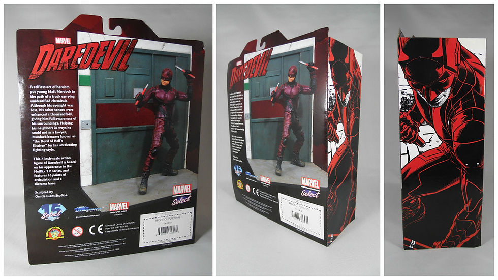 The large side art panel on most MCU Select releases sees an image of the character taken from the movie. For Daredevil the look is more comic art as they use the concept comic art of Joe Quesada that was used on the Season 2 poster and on the subsequent UK steelbook release. While striking and still linked to the Netflix series it sits more comfortably with the other comic book releases from a MIB collection.