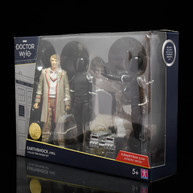 The packaging is a squared-off window box with deep blue borders and a silver secondary tone used on the Doctor Who logo in the top left and across the rest of the box where it acts as a backdrop for some TARDIS illustrations. The window wraps the top and right side of the box and displays all three figures along with a story-appropriate backdrop. The front of the box carries simply the story name, while the figures themselves are named on the right-hand spine and on the back of the box. Unlike other sets, there is no extensive write-up of the story on the box reverse.