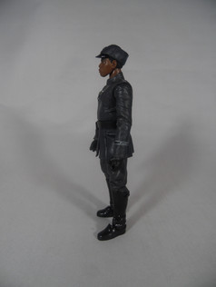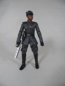 The uniform is a drab grey throughout, consistent with what we see in the movie being designed to evoke the look of the original Imperial officers and them themselves being inspired by German WW2 uniforms with the flared trousers and polished knee high boots. The uniform has some added detail including the canisters on the tunic and some trimming to the end of the left sleeve. There is also a decal here in aurebesh that is meant to translate as Dillon. We saw this on the First Order Officer two pack (with Ackbar) from Toys R Us, and there is no change to this wording on the Finn figure.