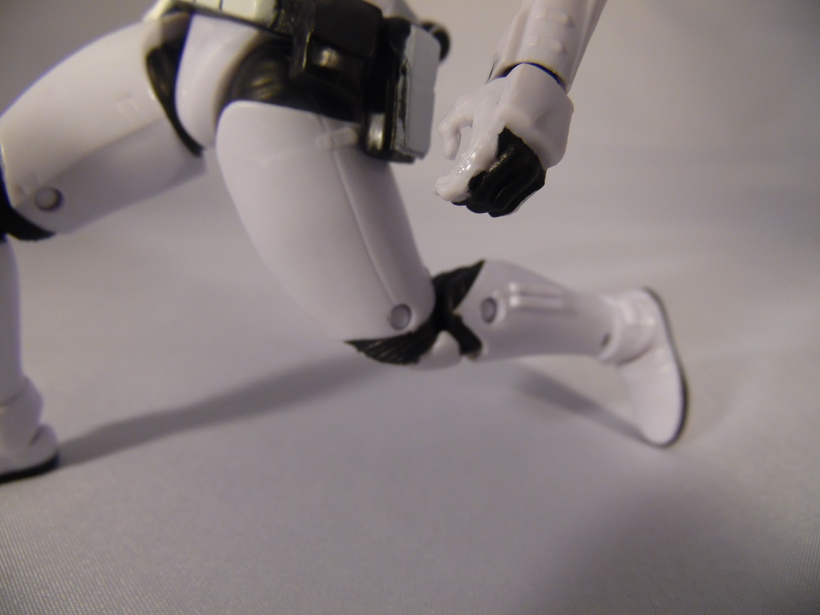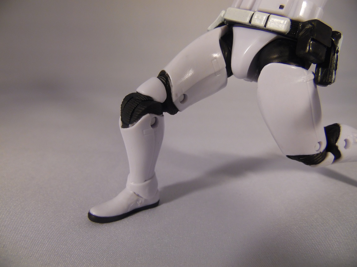 There is a nice torso joint on the Trooper which allows for a lot of movement - in fact you can rotate his whole chest area 360 degrees to his legs. There is no waist articulation, so down into the legs and they have a similar issue to the arms that despite hip and knee joints the armour stops getting down into a crouching or kneeling position so you will have to settle with a standing up stance for all your Troopers. The ankles are on rockers, so getting him to stand up is no issue.