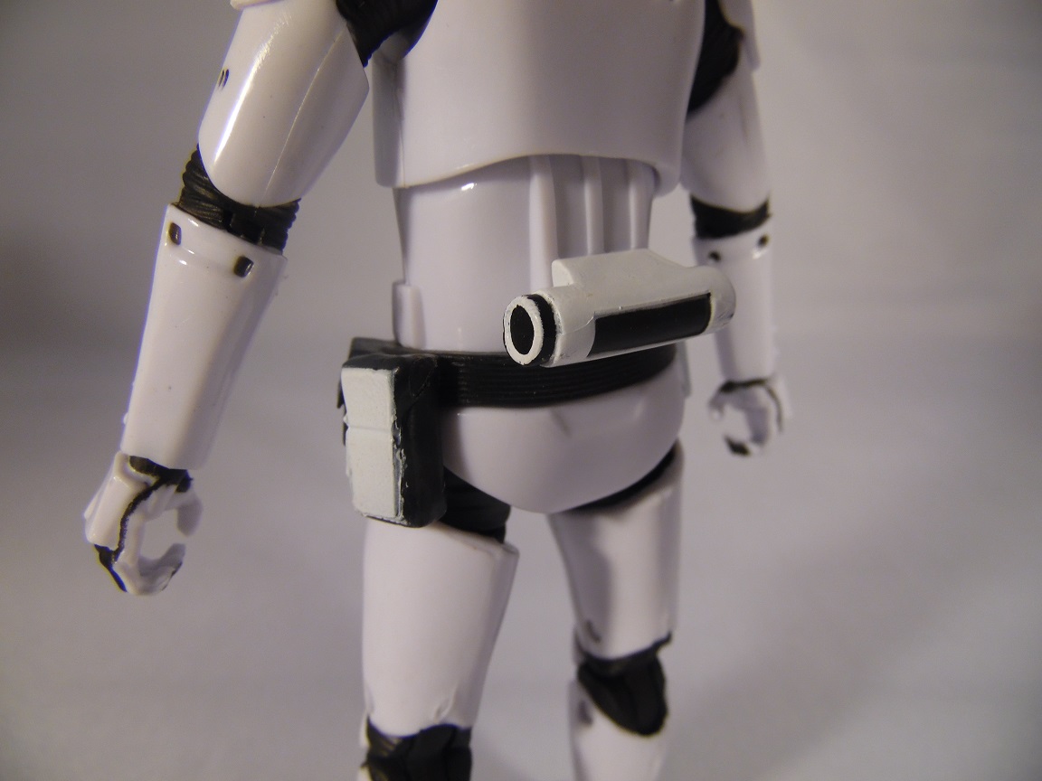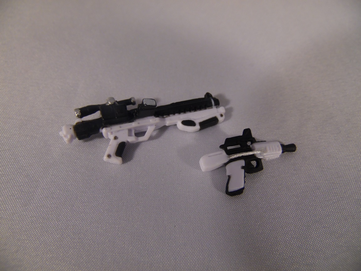 The two guns are nicely sculpted and then painted in a very nice black and white colour scheme. The larger gun fits neatly into the right hand with the finger going easily into the trigger. The smaller gun fits in both hands. And remember the holster issue - well there is actually a slot on the Trooper's right thigh and a corresponding groove on the gun, so the side arm slots onto the thigh and looks pretty cool - another advance in Storm Trooper equipment in the 30 years since Endor - I wonder if they have taught them to shoot straight yet?