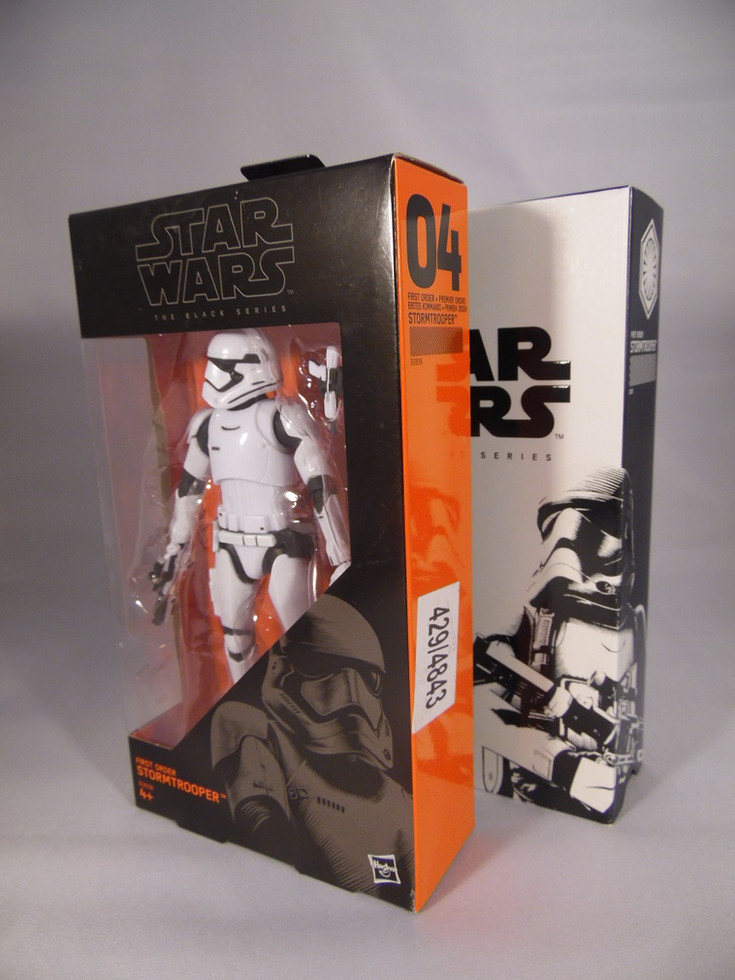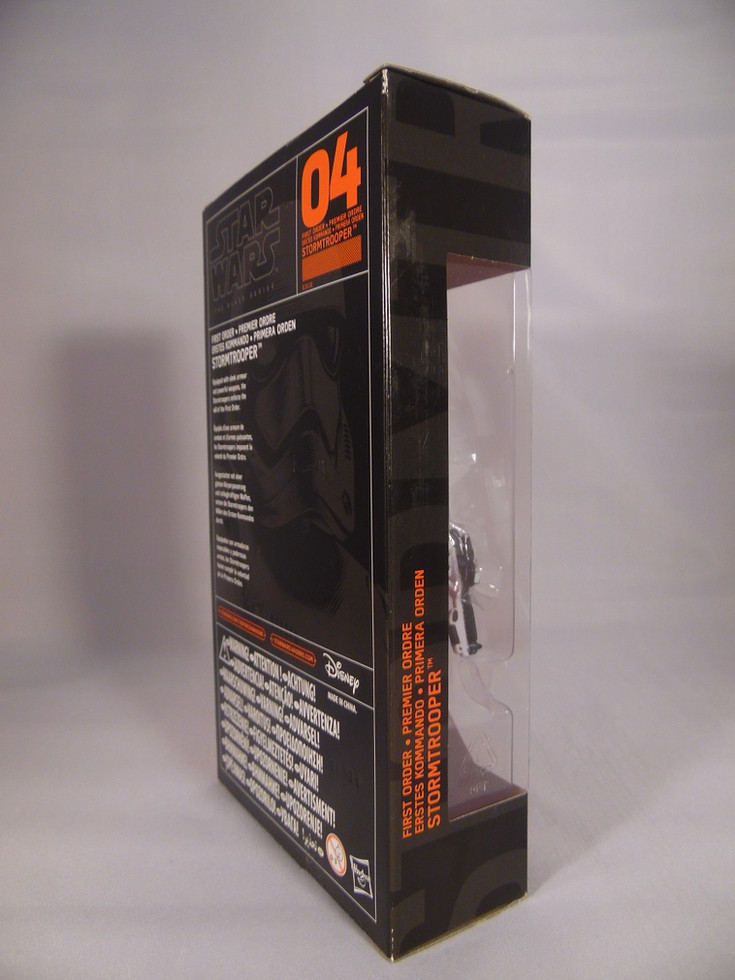 The First Order Storm Trooper, is #04 in Wave 1 of the TFA series . This is the identical figure which prior to Wave 1 was packed as an SDCC exclusive in a Black & White presentation box. This review is relevant for both figures, and images of the SDCC version can be found in the gallery.