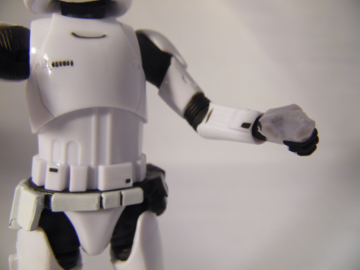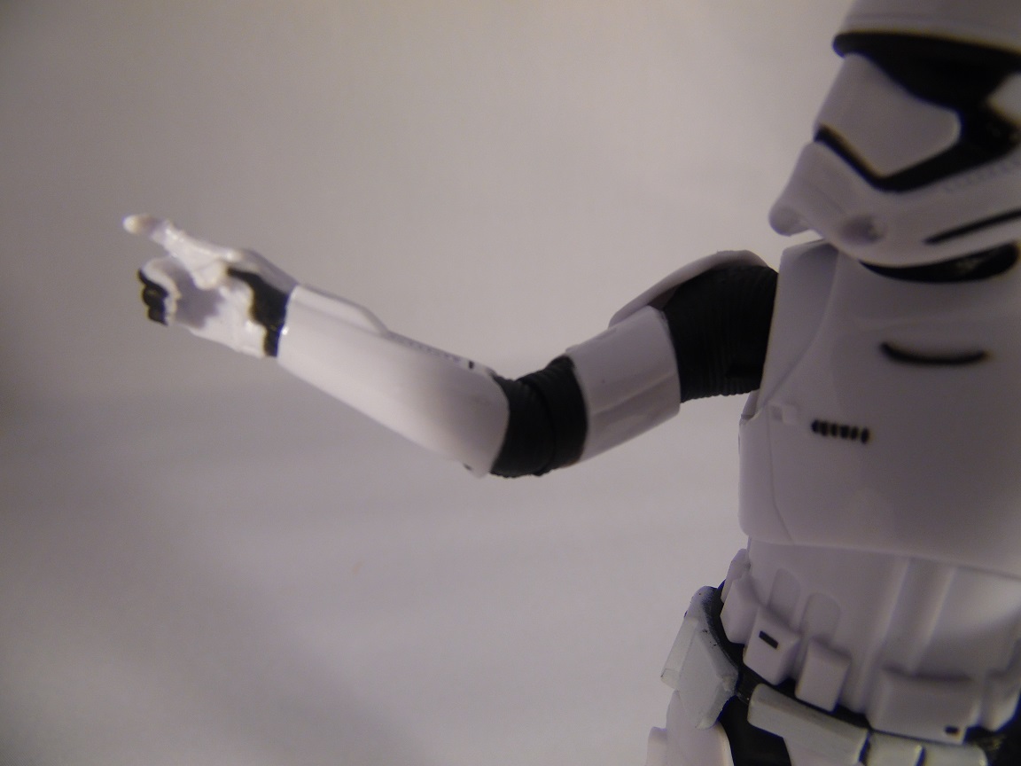 Articulation is OK, but not great. Starting with the head as we always do, this rotates a full 360 degrees and can look down slightly on its ball joint. Arms start with a jointed shoulder, but due to the shoulder panels of the armour you can only really get them up about 45 degrees to the body. The elbows rotate and are on a pivot joint, but again the armour doesn't allow them to reach a full 90 degree. These two issues combined mean your First Order Trooper will struggle to hold a gun naturally with both hands, unless you want to get radical and start customising your figure and cutting away parts of the armour. The wrists rotate and allow the hands to bend, so you can at least aim your gun even if it can't be held in both hands.