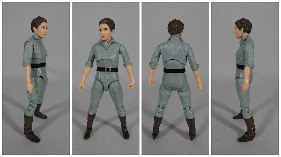 Pros : Excellent likeness to Carrie Fisher, even without the facial printing technique Cons : Some nasty paint variation from main outfit to legs. The changes to the back of box spoil the wonderful artwork.