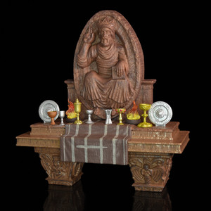 The main elements of the table are cast in a darker brown base colour with texture built into the cast plastic to recreate a wooden carved design which is then overlaid with a darker wash. There is a striped burgundy cloth worked into the plastic to be draped across the centre, and above all of this a sculpted figure of a seated figure wearing a crown. Beneath all of this, and holding the table upright, are a pair of inverted ornate carved legs.
