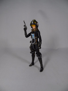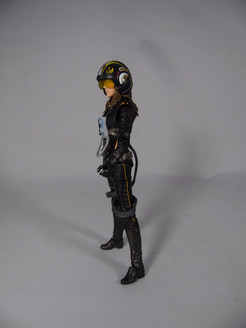 Jaina is clad in a black version of a Rebel Pilot uniform. Everything on here is a brand new piece for the figure and it is all done to a very high standard. The base suit is a slightly glossy black with orange pinstriping. Over this is the chest flak jacket with the life support system on top. There are straps leading from the chest that loop down and round the legs - this is all separate to the body and moves with the articulation.
