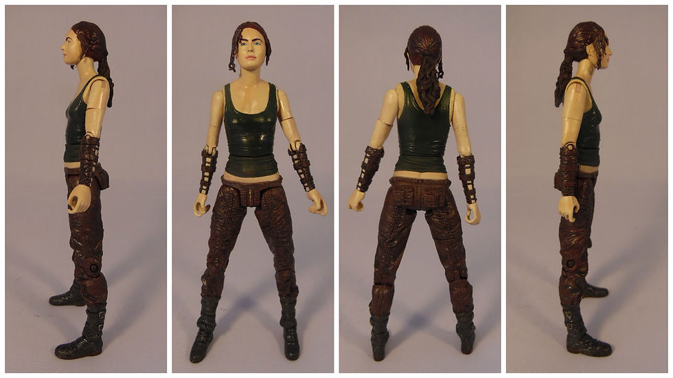 Let's press on though past this issue. Kyra stands 6 3/4 inches tall, so is shorter than the other male figures which does match the actual heights of the actors. The likeness to Alexa Davalos is not bad although it isn't helped by quite a flat paint job. That being said the eyes, eye brows and lips are all painted neatly. The hair is sculpted to hang down at one side and is tied into a pony tail at the back. The hair does benefit from some variation in colouring, with some auburn highlights against the dark brown.