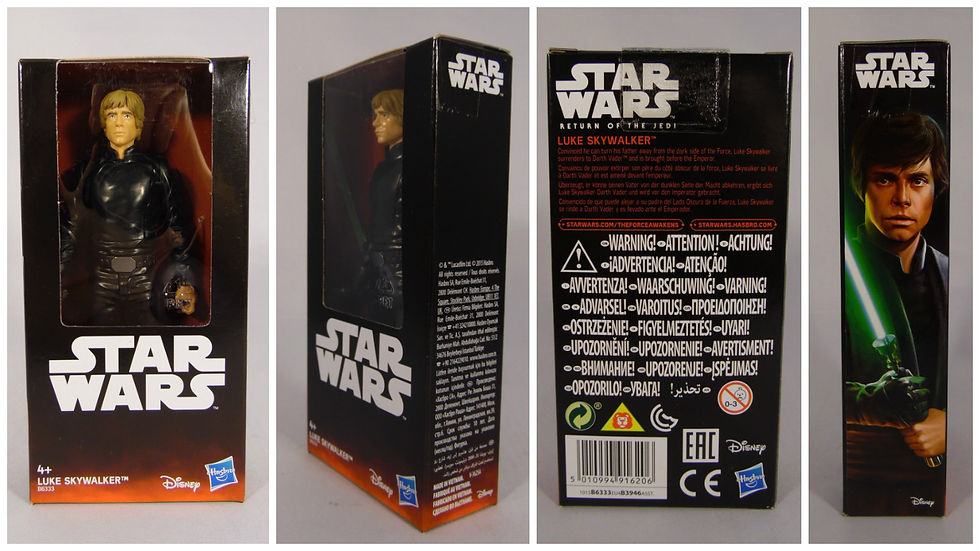 Each figure is packed in an economically sized box. This follows the design of the standard Star Wars line from Hasbro. The box starts at the base with a red glow, and fades to a black background through the rest of the packaging. The front is dominated by the window, through which the figure is visible on a Black Series style red insert card. A white Star Wars logo is planted underneath the window, while the character name sits very bottom left along with the recommended 4+ age. The Disney and Hasbro logo's sit side by side bottom right.