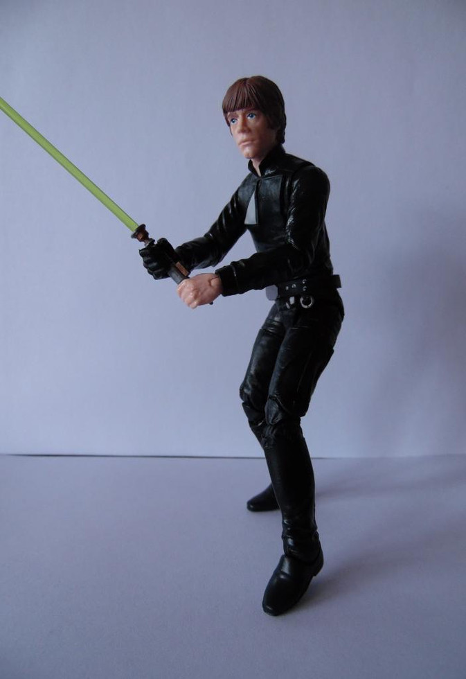 Putting this aside, Luke is a stunning figure. The two shirt pieces work really well. My preference is the open flapped version, just to add a little bit of difference to his black outfit. My head was painted pretty well and for me is a decent likeness for Mark Hamill. The beauty of this figure is pose-ability. After failing with Obi Wan and Anakin to get any decent poses for light-sabre duels or action poses - Luke is a joy, specifically holding the sabre with both hands.