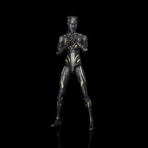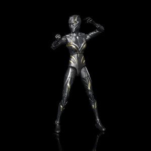 Black Panther is a brand new sculpt recreating Shuri’s suit as seen in Wakanda Forever. Like the prior releases of T’Challa the suit is cast entirely in black plastic featuring an embossed texture and more deeply cut sculpted panel lines. A selection of these lines within the suit are then picked out with gold paint, with a small amount of silver used on the upper chest and on the thighs. Despite the slim profile of these suit lines, the paint application in the main is neat and tidy. The gold colour does struggle against the base black and looks muted in places, while the reverse of the figure is devoid of any painted detail at all save some triangular panels round the lower legs.