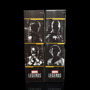 The left-hand side is a wrap-around of the window, while the right-hand side includes images of both characters. These images, which also sit on the back of the box, are done as a shadowed black and white illustration, building on the shadowy background of the characters. On the back and next to each image, is a short paragraph of yellow background text for each character detailing the situation both Walker and Sentry find themselves in, leading into the Thunderbolts* storyline. The backing card for the figures finishes the yellow theme, and includes a topographical design that further enhances the shadowy spycraft theme of the film and characters at the start of the movie.