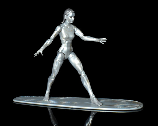 Moving on to the Surboard and this is an 8.5 inch silver cast shaped piece, complete with sculpted striations and ‘cosmic damage’ down the entire length. It lacks any paint applications, relying only on the base silver colour. It incorporates a single footpeg approximately a third of the way down the length from the front and slightly off to the right to favour the figures right foot.