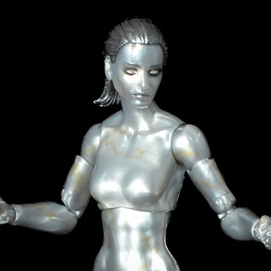 The headsculpt appears to replicate the onscreen character's look well enough, with Garner’s proportions and features built into the sculpt. The eyes are ringed in black as we see on screen, but include printed eyes, and the eyebrows and lips appear to be similarly applied. The Silver Surfer’s hair, an individual piece, is slicked back over her head, around the ear,s and down to the nape of her neck where it flicks out slightly. This is given a marginally darker silver decor with what could be a dark wash to trim the fringe line and the depths of the hair strand sculpting.