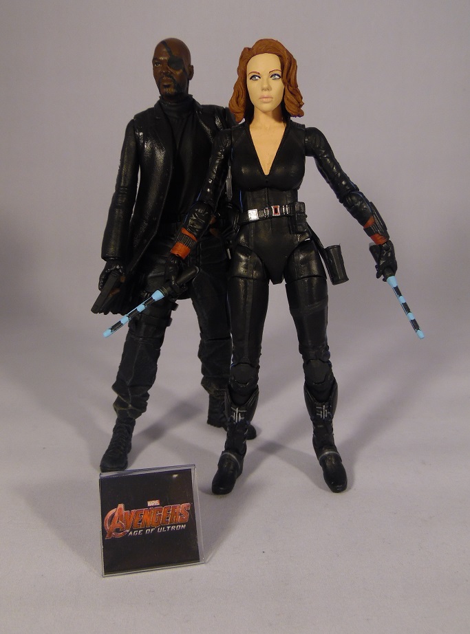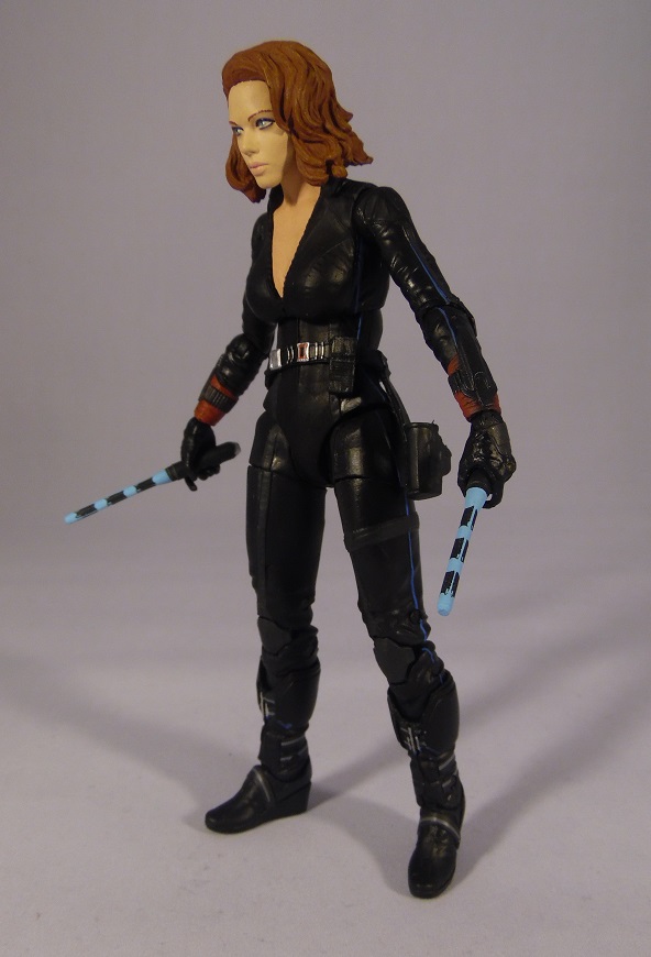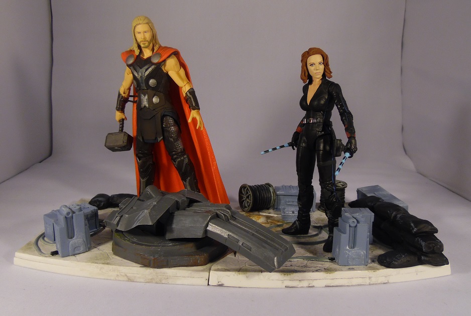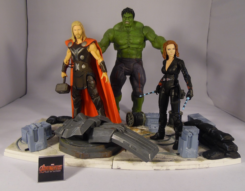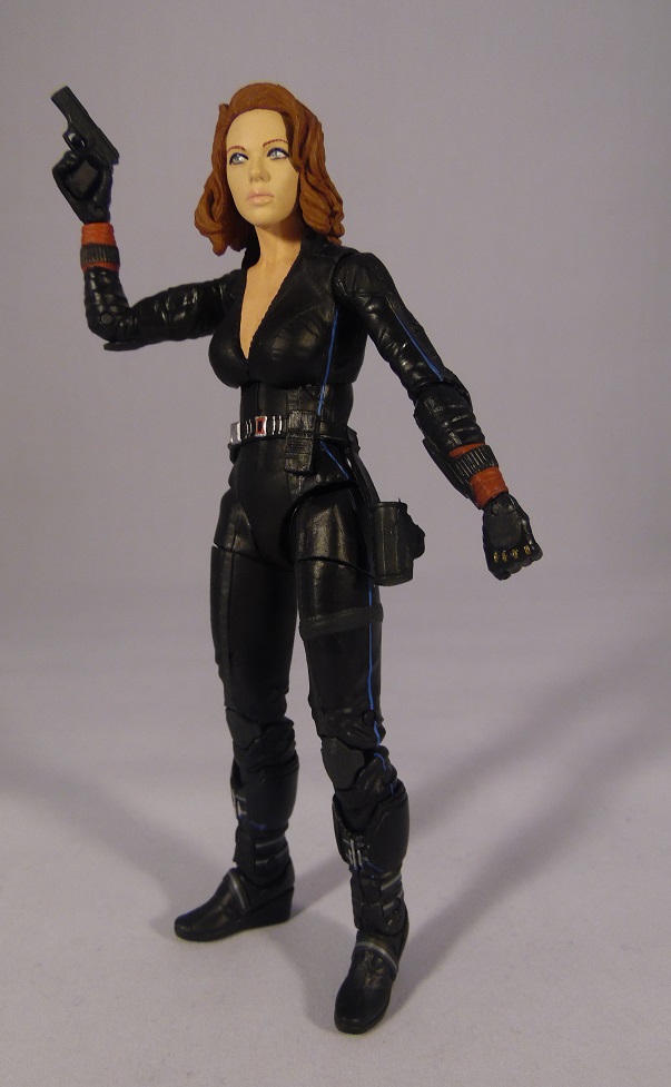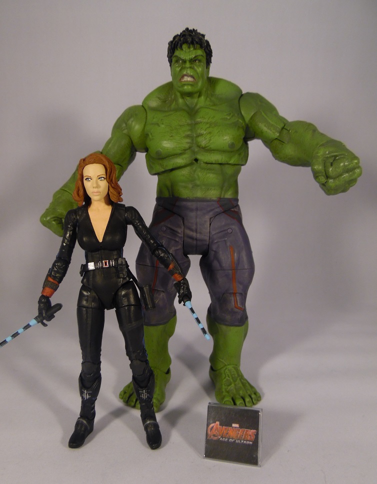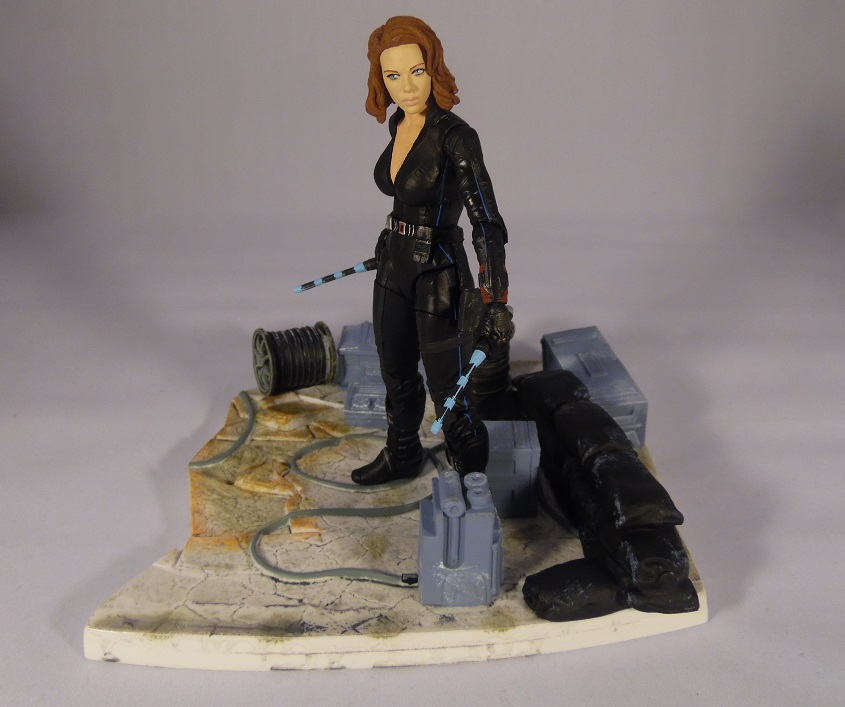 It has taken a little over 4-years, but Diamond have lived up their commitment to bring us a Black Widow figure and allow fans to finally Assemble the original 6 Avengers, albeit in varying outfits from the Marvel Cinematic Universe. Widow arrives alongside two tweaked figures in Thor and Hulk, and one might speculate that Diamond had to go with re-use figures in order to support a Black Widow figure - particularly when other companies never go much further than what they class as the Big 4 Avengers (Iron Man, Cap, Hulk and Thor). Widow arrives in the standard Select packaging and in the matching grey colouring they have used in 2015 for the Age of Ultron figures, and for the 2015 Ant-Man. The Avengers Initiative logo sits in the bottom left of the front panel and the character artwork panel is as striking as any I have seen so far. On the rear of the packaging is a small bio of Black Widow along with an action shot. What is interesting is that unlike other releases, the main action shot on the reverse is of Scarlet Johansson as Black Widow and not a shot of the figure - this was also found to be the case on the back of the Hulk & Thor packages. We can speculate as to why, but the simplest answer is probably the packaging went to print before the figure was signed off. Once out of the box Widow stands 7" high and when lined up to fellow Avengers she fits, albeit I would have expected her to be shorter than Hawkeye... Widow comes packed with the other half of the Age of Ultron themed base that we saw in the Thor pack (see above) more on this at the end of the review. Also packed in are a set of alternative hands, a pair of batons and a hand gun. Even though sculpted in the main by Gentle Giant, face sculpts have never been really strong with Diamond figures (Wolverine aside) but in this case it is a good likeness for Johannson and the hair in particular is really well sculpted. They have used a slightly too pale skin tone for Widow which does throw the face off a little, but the eyes and mouth are neatly done and the temptation to go with a ridiculous red lip gloss has been avoided unlike other female characters we have seen in other lines. The eyes on mine are looking to her right which you can see in many of the images below. I am not sure if this is intentional, but I think it adds character for my display. The hair is a good colour match and has both darker wash and brushed highlights to give it real depth. Onto the body and the proportions are pretty much right - so Widow doesn't look like a Barbie. The jumpsuit itself is very plain and painted a flat black, and the sculpted has "unzipped" the top a little further down than maybe Scarlett would have liked. When you start looking the jumpsuit is brought to life with varying panels and gadgets around the wrists and an electric blue stripe down the sides of the torso and down the arm. A separate belt piece sits neatly at the waist and provides a holster for the hand gun. Down into the legs and there are sculpted knee panels and a thigh strap which I think is meant to look like part of the holster. Instead of leaving these black they have been painted a different shade which is a nice touch. The boots are the most complex element of the costume and finish the costume nicely. Well done so far Diamond. The batons that are supplied are a representation of the ones Widow uses in Age of Ultron. Sadly the blue paint doesn't work. It is too light and in no way represents the electric batons we see in the movie. The gun therefore is my preferred weapon of choice, but there is only one. I would have loved to see two of them and allow fans to have a go at that famous two handed weapon pose from the first Avengers movie. Articulation starts with a ball jointed head that can rotate a full 360 degrees. Shoulders are ball jointed, and with Widow being in a tight fitting jumpsuit there is a massive range of motion both out to the side and up over the head. The elbows are jointed and the hands on both a swivel and a pivot. I am not 100% clear why a 2nd pair of hands has been provided as there isn't much difference between the two. They swap out easily enough, but I have found the set fitted in the packaging is sufficient to hold both the batons and the gun. Widow has a torso joint with another good range of movement allowing her to lean forward and lean backwards and to swivel her top torso to either side vs her waist. The waist itself is fixed as are most Select's nowadays. The hips are ball jointed and can move to the side to a splits position and also forward to an almost seated position. There is a thigh swivel which helps if you are going for an action pose - but sadly once turned the blue line of the costume doesn't line up and the thigh starts to look a peculiar shape. The knees bend on a double joint, as do the ankles. The cleverest part is a pivot half way between the ankle and the heel of the shoe which lets you get the leg out to the side while having the foot still planted flat to the floor. This allows for some nice crouching positions. The base that comes along with Widow is "OK". It's nothing special and doesn't scream Age of Ultron too me. Perhaps with some smashed Ultron drones in place it would have been elevated, but as it stands it is pretty average. There is no complexity in connected it to the Thor base, they simply but up against each other with no fixings. My only key issue as I write this review is quality, something I haven't really ever had a problem with on Marvel Select figures until this year. The Widow I received came out of the box with a removable left leg. It is not snapped, but rather the joint is mis-formed which means the leg pops on and off at will, mostly off when am trying to get her posed. As a one off I would put this down to factory error, but I had a similar factory mould issue on Ant-Man a month or so ago and have heard similar stories from other collectors. At this point I am awaiting a response from the sto