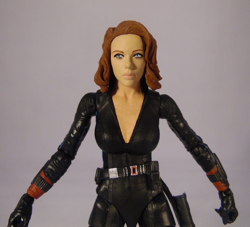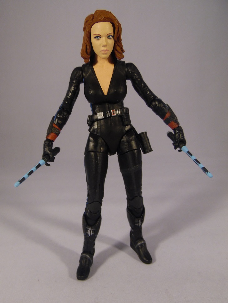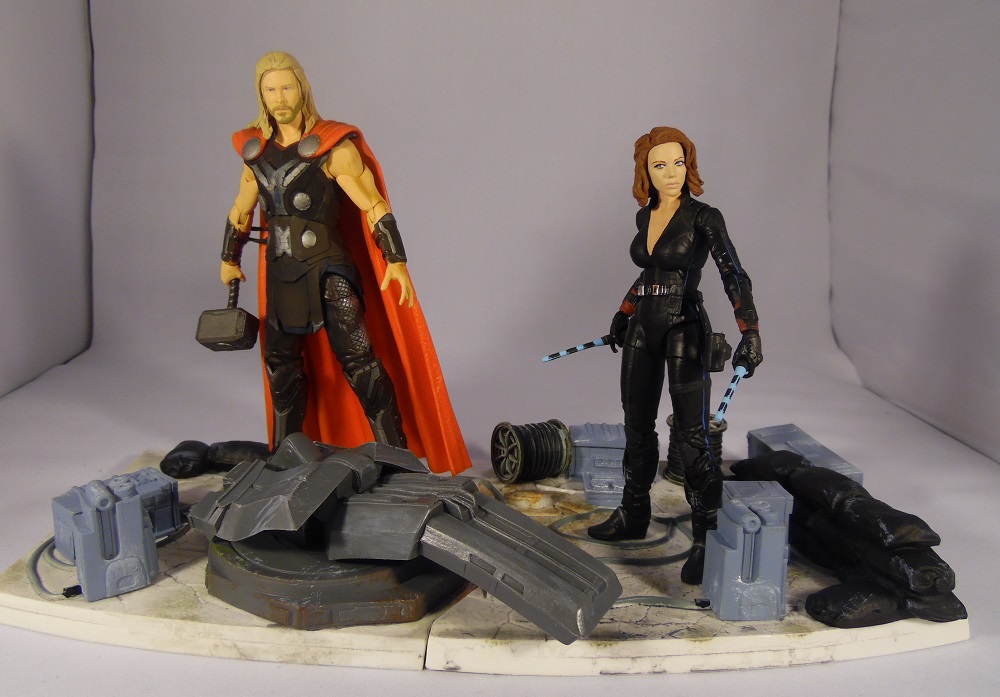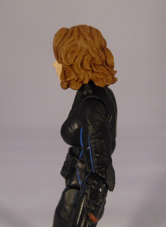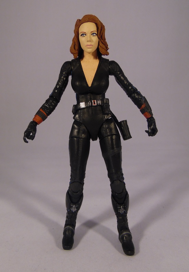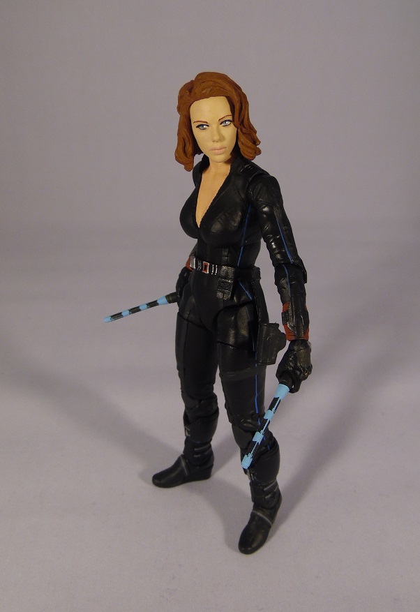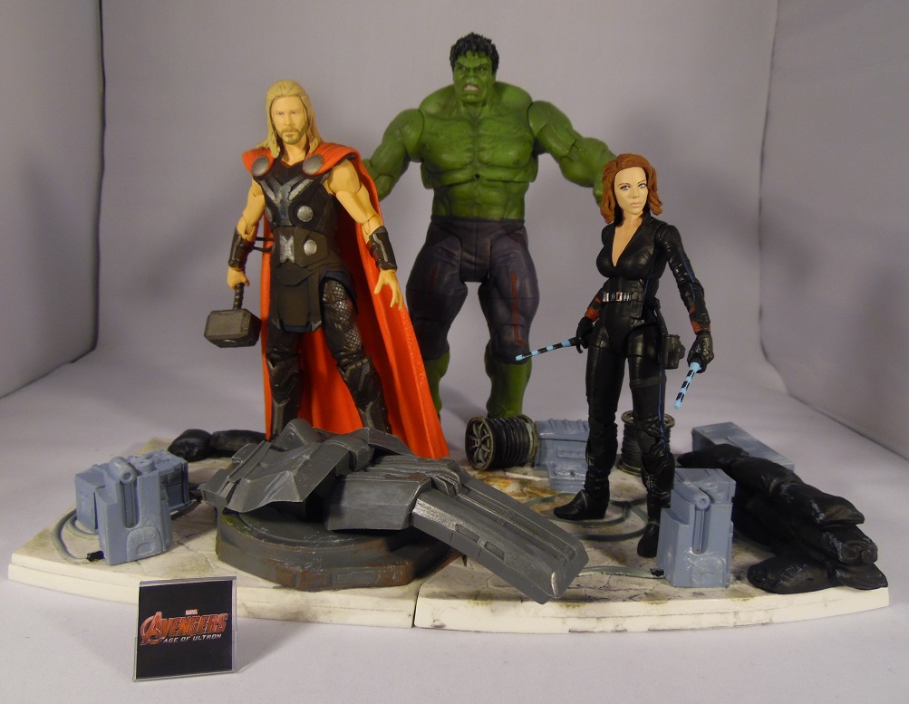 It has taken a little over 4-years, but Diamond have lived up their commitment to bring us a Black Widow figure and allow fans to finally Assemble the original 6 Avengers, albeit in varying outfits from the Marvel Cinematic Universe. Widow arrives alongside two tweaked figures in Thor and Hulk, and one might speculate that Diamond had to go with re-use figures in order to support a Black Widow figure - particularly when other companies never go much further than what they class as the Big 4 Avengers (Iron Man, Cap, Hulk and Thor). Widow arrives in the standard Select packaging and in the matching grey colouring they have used in 2015 for the Age of Ultron figures, and for the 2015 Ant-Man. The Avengers Initiative logo sits in the bottom left of the front panel and the character artwork panel is as striking as any I have seen so far. On the rear of the packaging is a small bio of Black Widow along with an action shot. What is interesting is that unlike other releases, the main action shot on the reverse is of Scarlet Johansson as Black Widow and not a shot of the figure - this was also found to be the case on the back of the Hulk & Thor packages. We can speculate as to why, but the simplest answer is probably the packaging went to print before the figure was signed off. Once out of the box Widow stands 7" high and when lined up to fellow Avengers she fits, albeit I would have expected her to be shorter than Hawkeye... Widow comes packed with the other half of the Age of Ultron themed base that we saw in the Thor pack (see above) more on this at the end of the review. Also packed in are a set of alternative hands, a pair of batons and a hand gun. Even though sculpted in the main by Gentle Giant, face sculpts have never been really strong with Diamond figures (Wolverine aside) but in this case it is a good likeness for Johannson and the hair in particular is really well sculpted. They have used a slightly too pale skin tone for Widow which does throw the face off a little, but the eyes and mouth are neatly done and the temptation to go with a ridiculous red lip gloss has been avoided unlike other female characters we have seen in other lines. The eyes on mine are looking to her right which you can see in many of the images below. I am not sure if this is intentional, but I think it adds character for my display. The hair is a good colour match and has both darker wash and brushed highlights to give it real depth. Onto the body and the proportions are pretty much right - so Widow doesn't look like a Barbie. The jumpsuit itself is very plain and painted a flat black, and the sculpted has "unzipped" the top a little further down than maybe Scarlett would have liked. When you start looking the jumpsuit is brought to life with varying panels and gadgets around the wrists and an electric blue stripe down the sides of the torso and down the arm. A separate belt piece sits neatly at the waist and provides a holster for the hand gun. Down into the legs and there are sculpted knee panels and a thigh strap which I think is meant to look like part of the holster. Instead of leaving these black they have been painted a different shade which is a nice touch. The boots are the most complex element of the costume and finish the costume nicely. Well done so far Diamond. The batons that are supplied are a representation of the ones Widow uses in Age of Ultron. Sadly the blue paint doesn't work. It is too light and in no way represents the electric batons we see in the movie. The gun therefore is my preferred weapon of choice, but there is only one. I would have loved to see two of them and allow fans to have a go at that famous two handed weapon pose from the first Avengers movie. Articulation starts with a ball jointed head that can rotate a full 360 degrees. Shoulders are ball jointed, and with Widow being in a tight fitting jumpsuit there is a massive range of motion both out to the side and up over the head. The elbows are jointed and the hands on both a swivel and a pivot. I am not 100% clear why a 2nd pair of hands has been provided as there isn't much difference between the two. They swap out easily enough, but I have found the set fitted in the packaging is sufficient to hold both the batons and the gun. Widow has a torso joint with another good range of movement allowing her to lean forward and lean backwards and to swivel her top torso to either side vs her waist. The waist itself is fixed as are most Select's nowadays. The hips are ball jointed and can move to the side to a splits position and also forward to an almost seated position. There is a thigh swivel which helps if you are going for an action pose - but sadly once turned the blue line of the costume doesn't line up and the thigh starts to look a peculiar shape. The knees bend on a double joint, as do the ankles. The cleverest part is a pivot half way between the ankle and the heel of the shoe which lets you get the leg out to the side while having the foot still planted flat to the floor. This allows for some nice crouching positions. The base that comes along with Widow is "OK". It's nothing special and doesn't scream Age of Ultron too me. Perhaps with some smashed Ultron drones in place it would have been elevated, but as it stands it is pretty average. There is no complexity in connected it to the Thor base, they simply but up against each other with no fixings. My only key issue as I write this review is quality, something I haven't really ever had a problem with on Marvel Select figures until this year. The Widow I received came out of the box with a removable left leg. It is not snapped, but rather the joint is mis-formed which means the leg pops on and off at will, mostly off when am trying to get her posed. As a one off I would put this down to factory error, but I had a similar factory mould issue on Ant-Man a month or so ago and have heard similar stories from other collectors. At this point I am awaiting a response from the sto