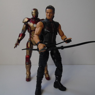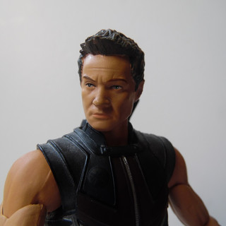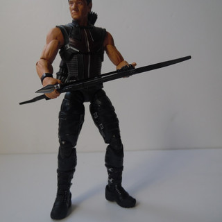Hawkeye first appeared in the Marvel Cinematic Universe in Thor, and then returned to play bad guy at first in Avengers (under Loki's control) and then coming good to take his rightful place as an Avenger for the climax of the film. This Marvel Select release is Hawkeye as seen in 2012 in the Avengers. Hawkeye looks lost in the huge box that Diamond uses for all his figures, and arrives with the usual box artwork and write up of the figure and the film. Hawkeye is packed in with a bow, one loose arrow, and a base piece which we will talk about later. Hawkeye stands 6.5 inches high, putting him as the smallest of the Avengers released so far by Diamond. I am not sure if this is actually two small, and need to put him alongside the upcoming Black Widow to be sure. The sculpt is pretty good all round, with a decent facial resemblance for Jeremy Renner. The first issue with the figure crops up straight away though as Clint comes without his iconic sunglasses. Granted in the film he is without them most of the time, but the sunglasses look was used in a lot of the film marketing. Having supplied other figures with two heads, it wouldnt have hurt to give fans an option of a sunglasses head. Hawk's body armour is nicely done with a SHIELD logo sculpted into the chest piece. His bare arms are sculpted similar to Thor's with some muscle definition., The legs contain some nice strap detail and the boots are also nicely done with various straps and buckles. My only gripe is the usual articulation over look, with the articulation they have used on his hips making them look a bit odd in that his thighs suddenly shrink where they meet his groin. Onto the hands and in particularly the left one which is sculpted with the shooting glove. This is right I hear you say, which it is absolutely - but then have a look at the position of his quiver? The quiver is positioned as though Hawkeye would draw with his right hand and hold the bow with his left. Pretty poor attention for detail. Thankfully the quiver, nicely sculpted as it is, is a separate piece and with some heat it can be twisted to face the right way (as it has been on all my pictures below). The right hand and wrist itself is also missing the strapping that Hawkeye wears in the film, replaced instead by what looks like a single sweat band Articulation includes the head swivel, and he can actually get almost a whole 180 degree motion with his head to look both left or right. Shoulders are jointed and then go into a bicep swivel and elbow joint, finally you can rotate the wrists - this means that with some patience you can get Clint into a half decent arching position, well at least stringing an arrow if not looking like he is about to let one fly, There are ball jointed hips and knee articulation but no thigh swivel on this one. He also comes with the ankle rockers to help stability. I cant find any paint issues, with nice skin tone and nice detail to the armour with a degree of shading. The zips, belts and buckles are also all picked out nicely in silver even down to lace holes in both boots. The bow is pretty nice and fits in either hand. It is plain black, but with some red detail around the hand grip. The sole arrow is a nice touch. Although you cant get Hawk to hold it securely you can prop it into a "stringing my bow" position and can get him into a pose where he looks like he is drawing that arrow from his quiver - but only if you keep the quiver on the wrong side. Hawkeye comes with another of Diamond's scenery pieces, this time with what is meant to be an iron railing. It's OK, but it isnt brilliant - and a trick was certainly missed not making it wall hangable and a bit wider so Hawkeye can actually stand on it properly and aim his bow. The piece links up to an identical piece that comes with the Chitauri to make a larger scenery piece - the issue here (not pictured) is that the Chitauri piece is painted differently so they look really odd when placed together, I am really pleased Diamond gave us Hawkeye and that they are brave enough to go with secondary and even tertiary characters. It would have been dead easy for them to use one of their Avengers slots in 2012 for another Cpt America or a re-released Thor. I would love to score Hawkeye highly, but you have to look at the flaws like the hip joints and the quiver position. That drops Hawkeye to 3 out of 5.