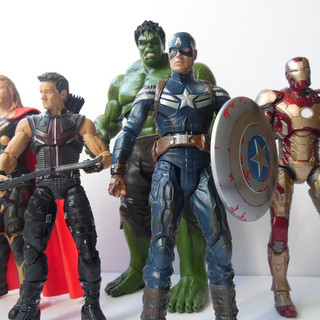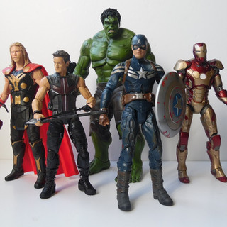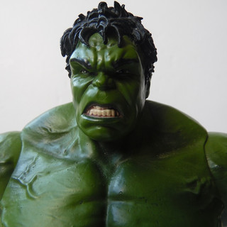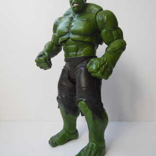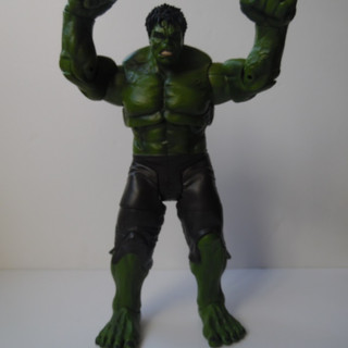 Over the years Diamond have put out a number of different versions of The Hulk, from the Grey Ultimate Hulk to the more traditional green versions. In 2012, and as part of a series of figures from Avengers Assemble, DST released a movie hulk. Hulk is a big piece of plastic, standing 10" high and coming in around 6" across. Like many DST oversize figures he is pretty heavy, but is supplied without the usual base/accessories you would see in the normal size figures. Due to the way DST pack their select figures, Hulk arrives in the same sized box and therefore fits perfectly into any MOC collection. Once unpacked you can start to appreciate the sculpt on this hulk. From the giant veined feet through to the 6-pack and bulging arm muscles the body captures Hulk, albeit a little under-defined (but that could be the paint job). The trousers are a bit plain, but do their job and are sculpted around the knee joints. The head and hair is also nicely sculpted BUT they didn't pick a particularly good look. Whilst trying to capture the Hulk snarl, they kind of lost the figure a little and left hulk with a kind of half smile, part snarl and part showing the dentist his gnashers. Onto paint, and another mark off for this figure as he is very one tone of green - and the green is probably a little too dark for Hulk, and particularly for Hulk as a 10" figure. The upcoming Age of Ultron repaint looks to have got the skin tone and more depth of detail - so we look forward to that. Hulks pants are a flat grey and there is some bleed into the knees. The toes nails are painted and there is also decent detail on the teeth, lips and eyes. The hair is a bit flat too, painted one shade of near black. Articulation is pretty good considering the bulk of the figure. The head is ball jointed and can look, to a degree, up down and side to side. The shoulders are jointed to allow the arms to go out 90 degrees to the body, and they also swivel to allow hulk to raise the arms above his head ready to SMASH. Further down the elbows are jointed and their is swivel in the wrist The torso is jointed, so Hulk can swivel at the chest. But there is no waist articulation. The hips can move, but dont really move particularly far and that means Hulk is pretty much limited to a neutral stance. The knees bend, and thankfully there are rocker joints on the ankles to allow Hulk's feet to be planted flatly and keep him pretty stable. This is not the perfect movie Hulk, and looking at it neither is the AoU version - although this 2015 update will be a significant improvement. Hulk is not a bad figure by any means, but he has the potential to be so much better with a slicker paint job and a re-sculpted head. He looks great in any display, coming into his own towering over the usual 7" scale figures in either an Avengers setup or battling against Chitauri or Loki. Hulk weighs in with a 3 out of 5, and it will be interesting to see if the AoU update is tweaked enough to get up to a 4 when I have it in hand. I also look forward to posing Hulk with the upcoming Widow figure.