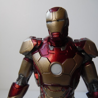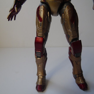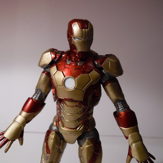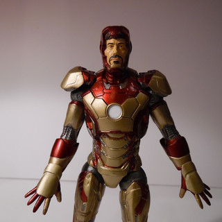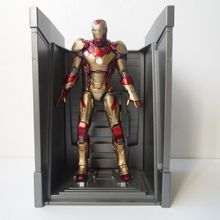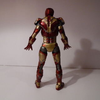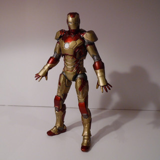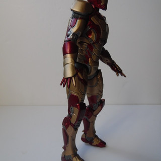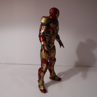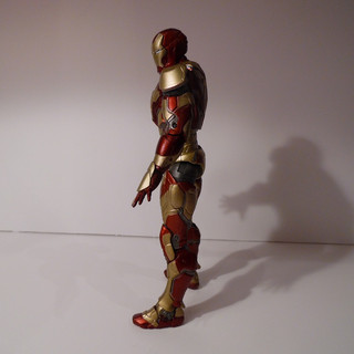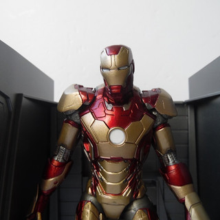 The Mark 42 suit was released by Diamond in 2013 and was the first DST Movie Figure I purchased - so this is the figure that started that arm of my collection and hence it has a place close to my heart. Despite this emotional attachment I will aim to be objective in this review. Out of the box the figure stands 7 1/2" high, a tad taller than the Mk6. He comes supplied with an alternative unmasked head, alternative hands (one set open palm, one set fist clenched) and the Stark Hall of Armour alcove. Sculpting on this suit is top notch, there is just detail after detail built into the panels. The standard head is much meaner looking than the Mk6 and the unmasked version has a cleaner sculpt for Tony. Although this could be paint applications, I would expect they at least tweaked a 3 year old sculpt on this release. Paint is where this armour fails. Unlike the Mk6 (official and knock off) which is shiny and pretty, the Mk42 is just a little dull. The paint is metallic, just not bright enough and that becomes more evident if you stand the Mk42 next to a Mk6. The other element that I don't like is the joints which are a painted a pretty flat part-metallic grey and to me almost look like they have been "missed" when the factory painted the model - the hip joints being the most prominent