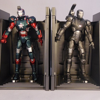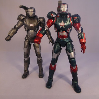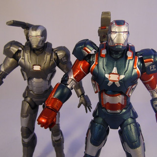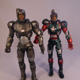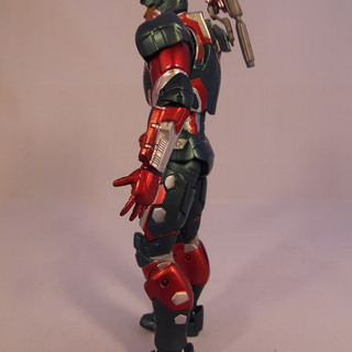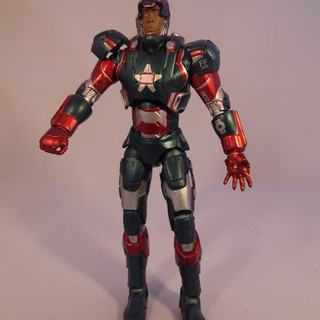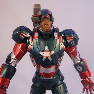 As is often the case Diamond Select produced an exclusive figure for Iron Man 3 which was sold exclusively in Disney Stores. The Iron Patriot is a repaint of War Machine and actually reflects more accurately what was seen in the film. We have covered the sculpt and articulation of this figure in our War Machine review, so if you have arrived here first then CLICK THROUGH to have a read of the War Machine review above to see what I think about the sculpt and articulation. The only difference between War Machine Mark 2 and the Iron Patriot is the same difference as the film, a paint job,. And what a paint job this is. Where as War Machine was a very muted monotone figure, Patriot just screams "look at me" even upstaging any of the Iron Man figures in your display. In the symbolic Red and Blue, both of these colours are applied in a a sharp metallic finish with the infils done in silver. The silver pieces appear much more reflective and brighter than the paint used on War Machine which gives the whole figure a sparkle. The decals are still included with wording on the shoulder pads and the forearms. Patriot also comes with the two head options - with the unmasked version being Colonel Rhodes and in my case is a bit crisper on the paint finish than the War Machine head. Iron Patriot however still carries the same gripes as its base companion with a wobbly right leg impeding him standing well and the shoulder cannon feeling flimsy. Because of these I can't score Patriot past the same 4 out of 5 I gave War Machine.... even with a killer paint job
