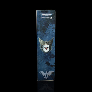 The rear of the box utilises promotional artwork for the game, with a Blood Ravens Marine in the top centre overlooking advancing troops across the hemisphere of a planet, including a Dreadnaught. The Marine in question is a generic troop and not the Infiltrator included in this set.